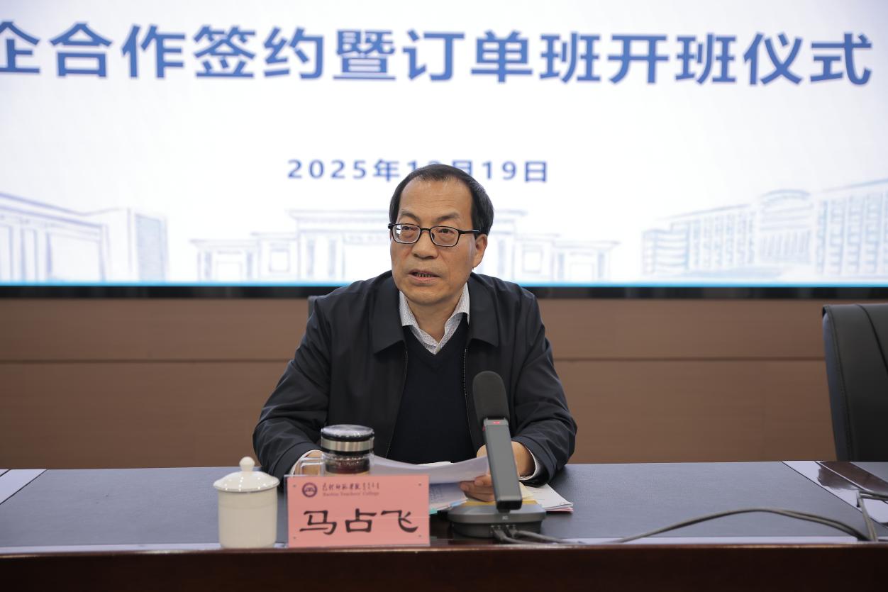 会上,马占飞在致辞中强调此次与汇能卓正深度合作,是深入贯彻落实国家产教融合战略、促进大学生高质量就业的重要举措,是校企协同育人路径的新探索,实现了“产业链、教育链、人才链、创新链”的有效衔接。希望今后进一步加强在实习实践基地建设、订单班人才培养、产学研协同创新等方面深化合作。他寄语订单班学生珍惜机遇,在校企合作的平台上实现成长与蜕变,未来成为企业发展的骨干力量。