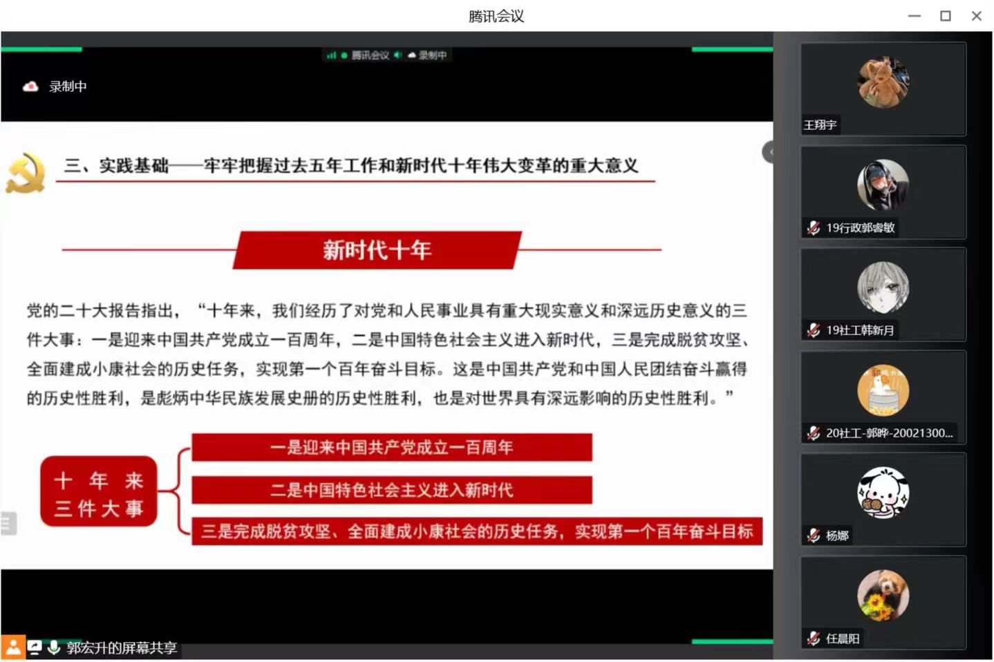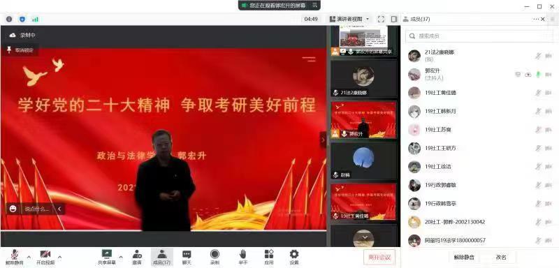 郭宏升副书记首先从“党的二十大和考研的关系、缓解疫情防控过程中考研前紧张焦虑的情绪、学院能为大家做些什么”三个方面介绍了举办此次活动的原因,接着用两道考题开篇,引入了党的二十大报告,他从“重大意义、大会主题、实践基础、理论指导、基本路径、根本保证、团结要求”七个方面介绍了党的二十大、二十大报告的内容和框架结构,对这些内容中可能出现的考题做了详细的分析和解读,说明了需要记忆的考点和知识点,精选了一些典型试题和线上的同学们展开了互动,交流了答题的技巧和方法。最后,郭书记为考研的同学送出了诚挚的祝福。他说道,无论何时何地,政法学院都和同学们在一起,是你们坚强的后盾,希望同学们全力以赴在21天后的硕士研究生考试中奋勇前行、金榜题名!