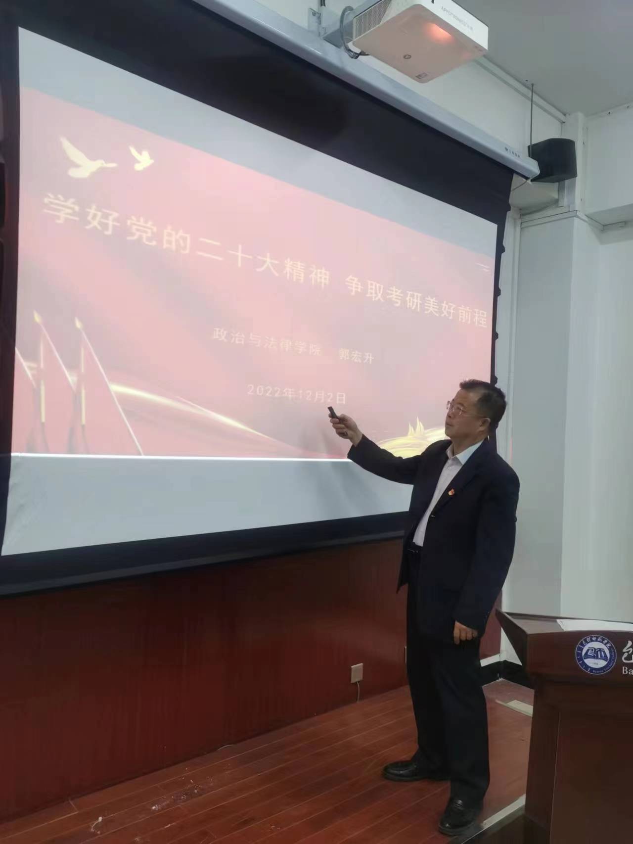 为了助政法和马克思主义学院考研学子一臂之力,12月2日晚,政法学院联合马克思主义学院在博学楼东602教室开展了一场题为“学好党的二十大精神 争取考研美好前程”专题讲座。政法、马克思主义学院64名考研同学在超星学习通上聆听了讲座,讲座由政法学院党总支副书记郭宏升主讲。