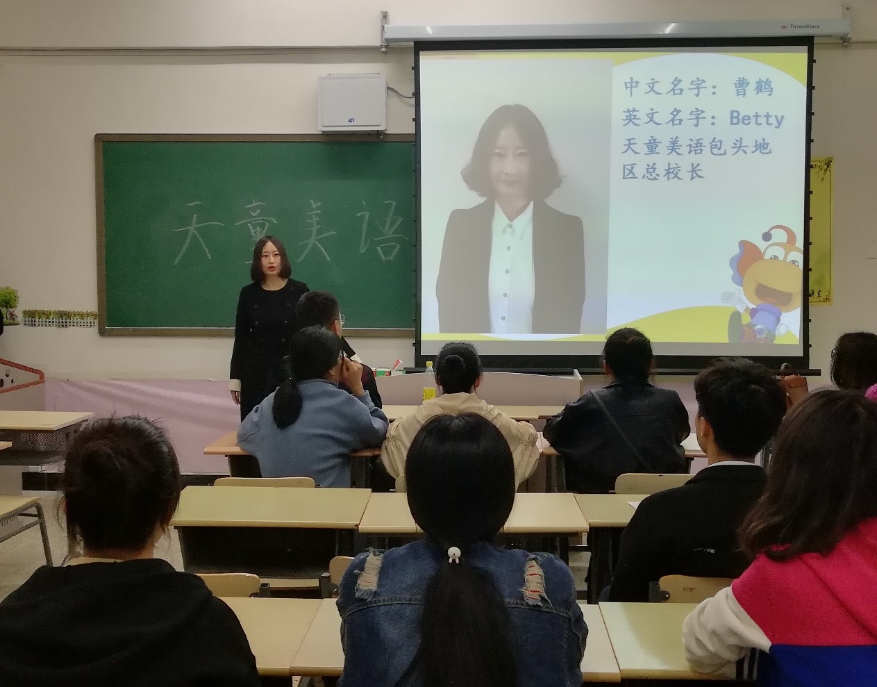3月23日为天童美语专场招聘会。天童美语包头部总校长介绍了公司的规章制度、福利待遇、企业文化、产业结构、组织构架、人力资源政策等内容,并现场为学生答疑。此外,已经在天童美语工作3年的2015届毕业生高鑫也出席了招聘会,并与学弟学妹们分享了自己的工作经历和心路历程。