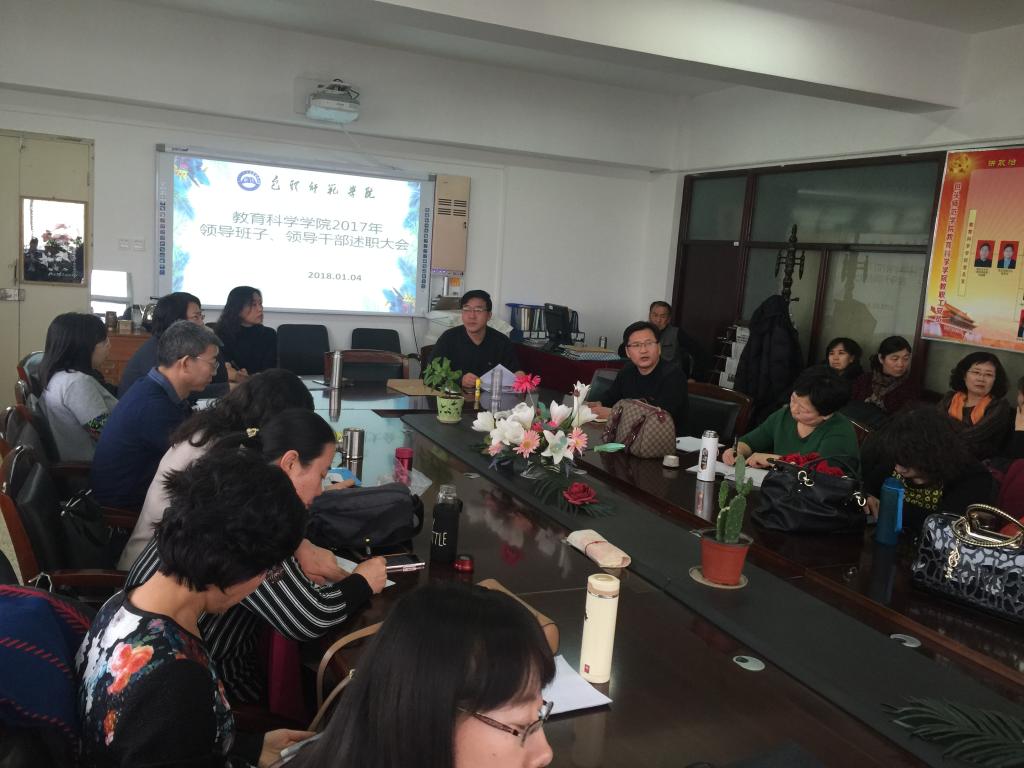 1月4日下午,教育科学学院召开2017年领导班子、领导干部述职大会,学院领导班子及全体教师参加了会议,学校考核小组冯平老师和马楠老师参加会议。