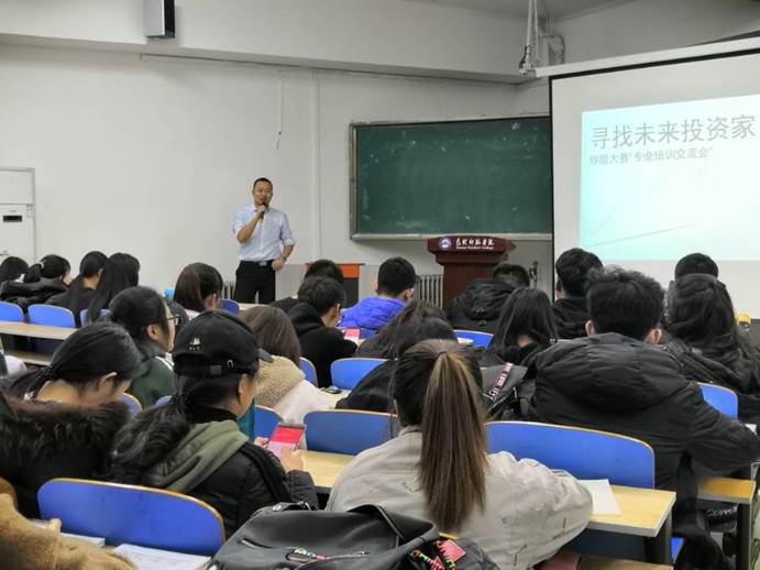 11月15日晚,经管学院大学生社团联合会在博学楼西606举办“寻找未来投资家”——“炒股大赛”专业培训交流会,中国建设银行包头分行工作人员马智超为同学们进一步介绍股票的相关知识。