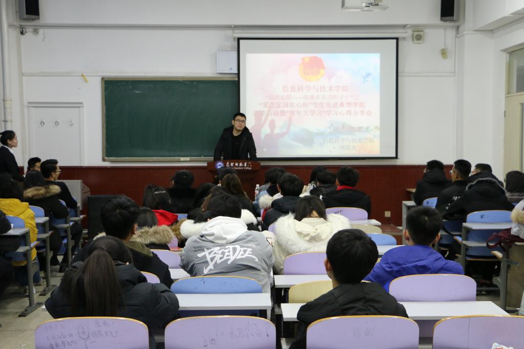 为深入贯彻落实习近平新时代中国特色社会主义思想和党的十九大精神,教育和引导广大青年学生爱国、担当、奋斗,提升政治理论素养,争做担当民族复兴大任的时代新人,2018年12月5日晚,信息学院在博学楼东201举办了 “我的肩膀——能挑多重的担子?”之“常念家国在心怀”学生先进典型学院巡讲暨“青年大学习”学习心得分享会。信息学院团总支书记丁坤,辅导员王凝、姜嘉丽,学生会主席团代表、各班团支书记、班长和团小组组长代表参加了分享会。