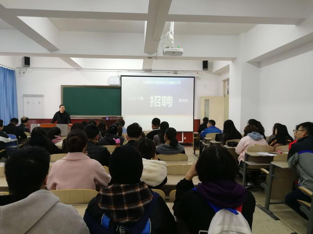 首先,公司人力专员王磊为同学们播放了内蒙古汇能煤化工有限公司的宣传片。随后公司领导通过互动等形式与同学们相互交流,沟通,充分了解同学们的具体情况,也让同学们了解公司的发展前景。最后,工作人员通过生动的演讲使同学们对汇能煤化工有限公司有了更深的认识,对自己的人生目标有了新的想法。