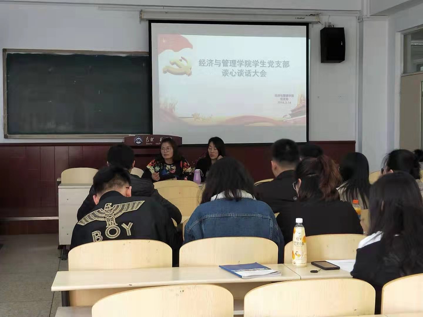 为加强党的政治建设,突出基层党组织的政治功能,提升基层党组织组织力,提高基层党建工作质量,3月14号下午三点,经济与管理学院学生第一、第二党支部在博东103召开谈心谈话会,全体学生党员、学生第一党支部书记袁爱荣、第二党支部书记陈丽芳参会,会议由学生第二党支部书记陈丽芳主持。