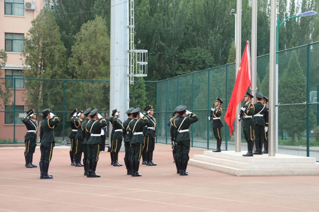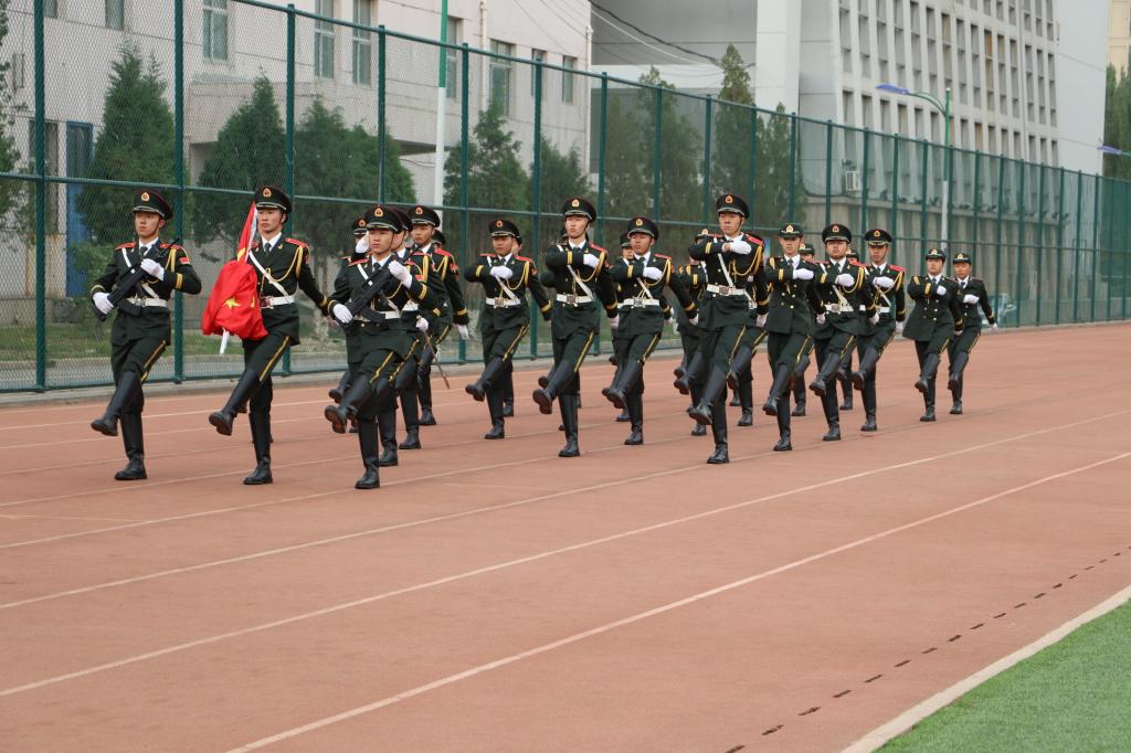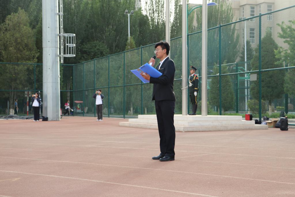 6:50,国旗班庄严的仪仗护卫队护卫着国旗走入场内。国旗护卫队的队员们迈着整齐的步伐,护送国旗入场,伴着庄严嘹亮的国歌,五星红旗冉冉升起,全体师生行注目礼,向冉冉升起的国旗致以最崇高的敬意,心中无比自豪。升旗仪式由院学生会主席、学生党员鞠鸿鹏同志主持。